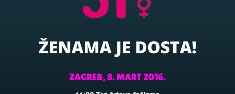 “I ove godine, u 20. godini od osnivanja Ženske mreže, obilježavamo 8.mart, Međunarodni dan žena, centralnim događajem u Zagrebu. „ŽENAMA JE DOSTA!“ središnja je poruka protesta koji započinje u utorak 8.3. u 11 sati okupljanjem na Trgu žrtava fašizma, odakle ćemo krenuti Ulicom Račkog, zatim Jurišićevom, preko Trga Bana J. Jelačića do Trga sv. Marka, na kojem ćemo u 12 sati održati program i izraziti svoje nezadovoljstvo sve grubljim kršenjem ženskih prava, dokidanjem stečenih prava i sve glasnijim najavljivanjem mjera i propisa koje vode pogoršanju ionako lošeg položaja žena u društvu.”