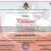 Profesore. Dr. Bajram Haljiti, predsjednik Instituta za europske studije roma i istraživanja protiv zločina čovječanstva i međunarodnog zakona u Tuzli, BIH, 2 studenog 2018 godine, predao je priznanje Indira Bajramović, predsjednici udruge žena Romkinja u Tuzli za nesebično zagovaranje za Rome, obrazovanje za prava žena i emancipaciju, kao i prilagodbu izazovima civilizacije u 21. stoljeću.civilizacije.